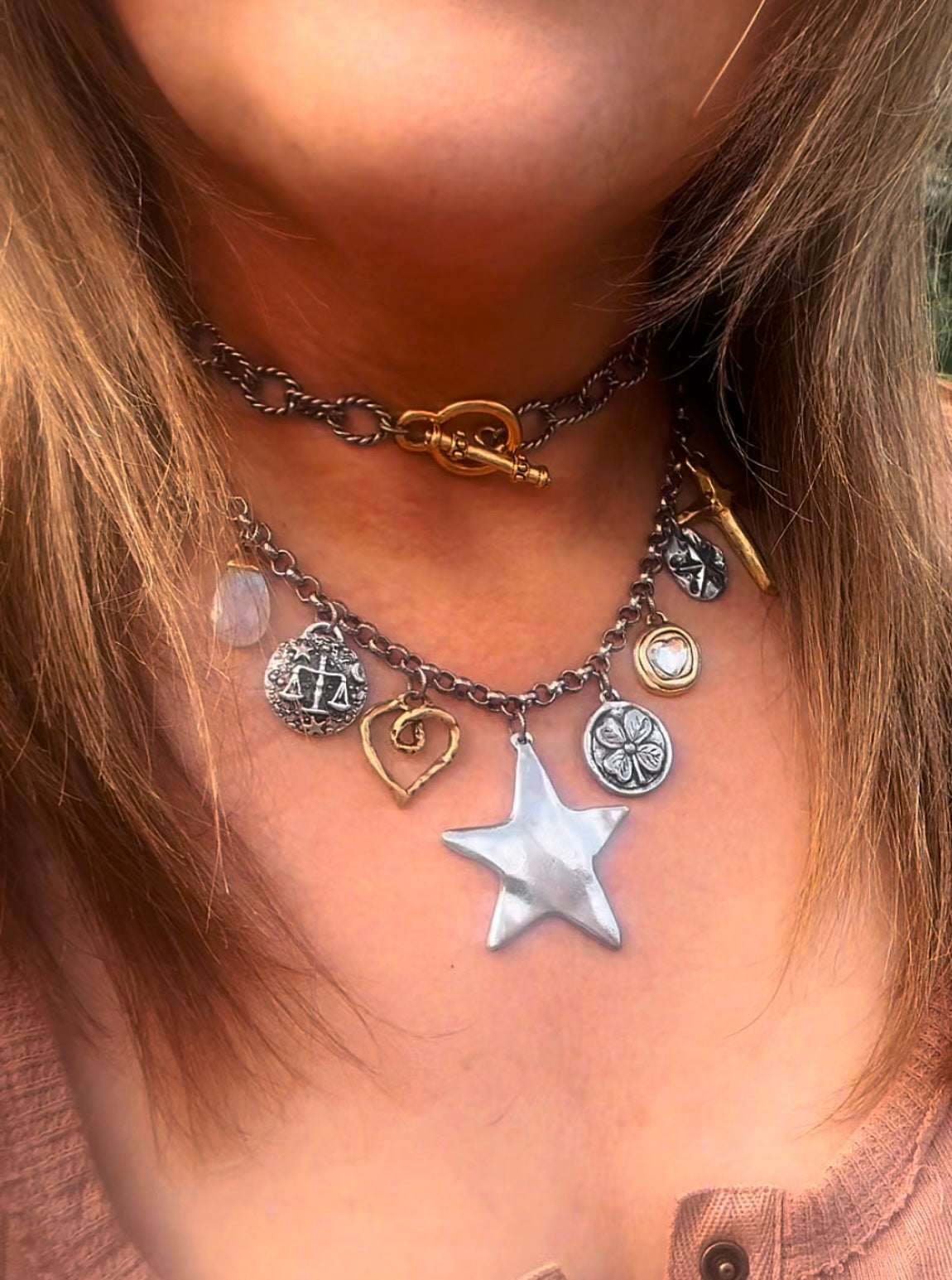 This Mixed Metal Layer features a fun necklace stack. Includes a stack of 3 chains blending gold-filled and silver tones for a playful mix-and-match look. With over hundreds of charms to choose from, the possibilities are endless!